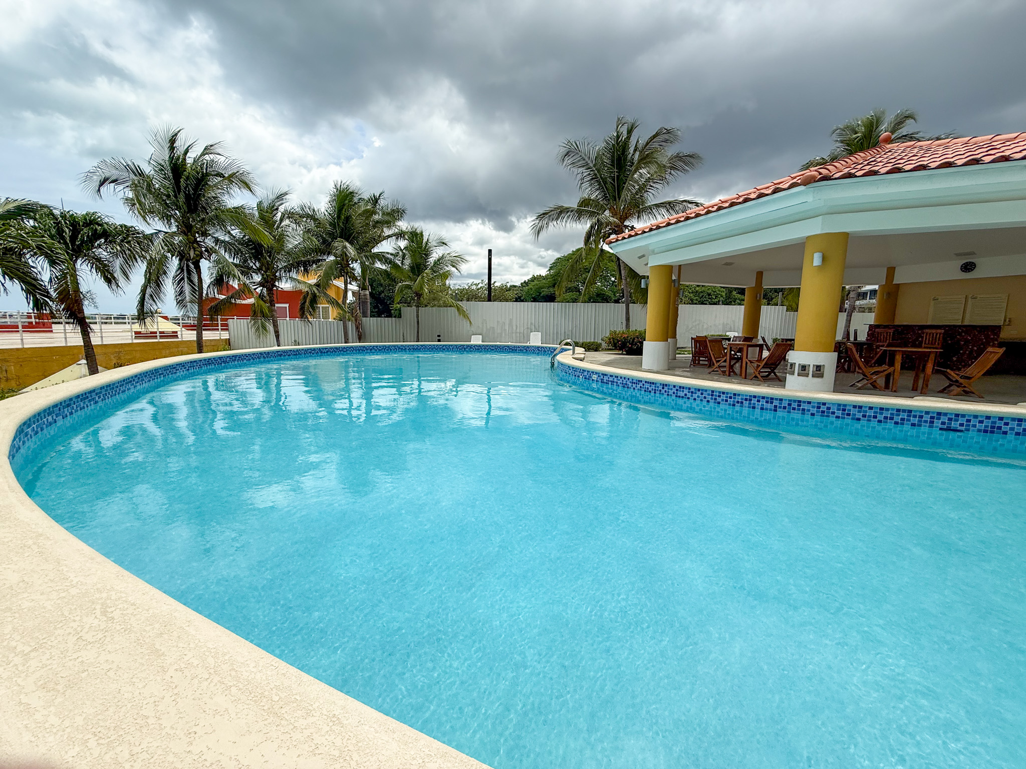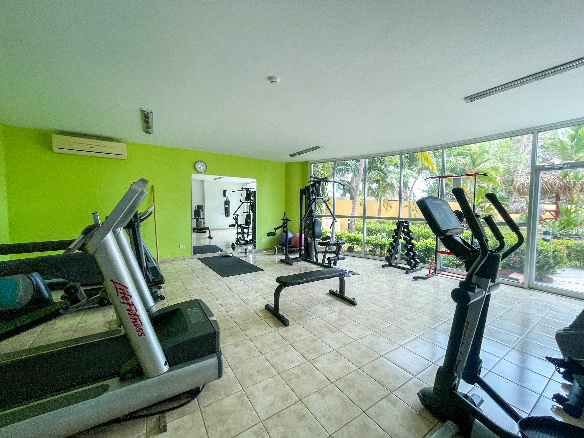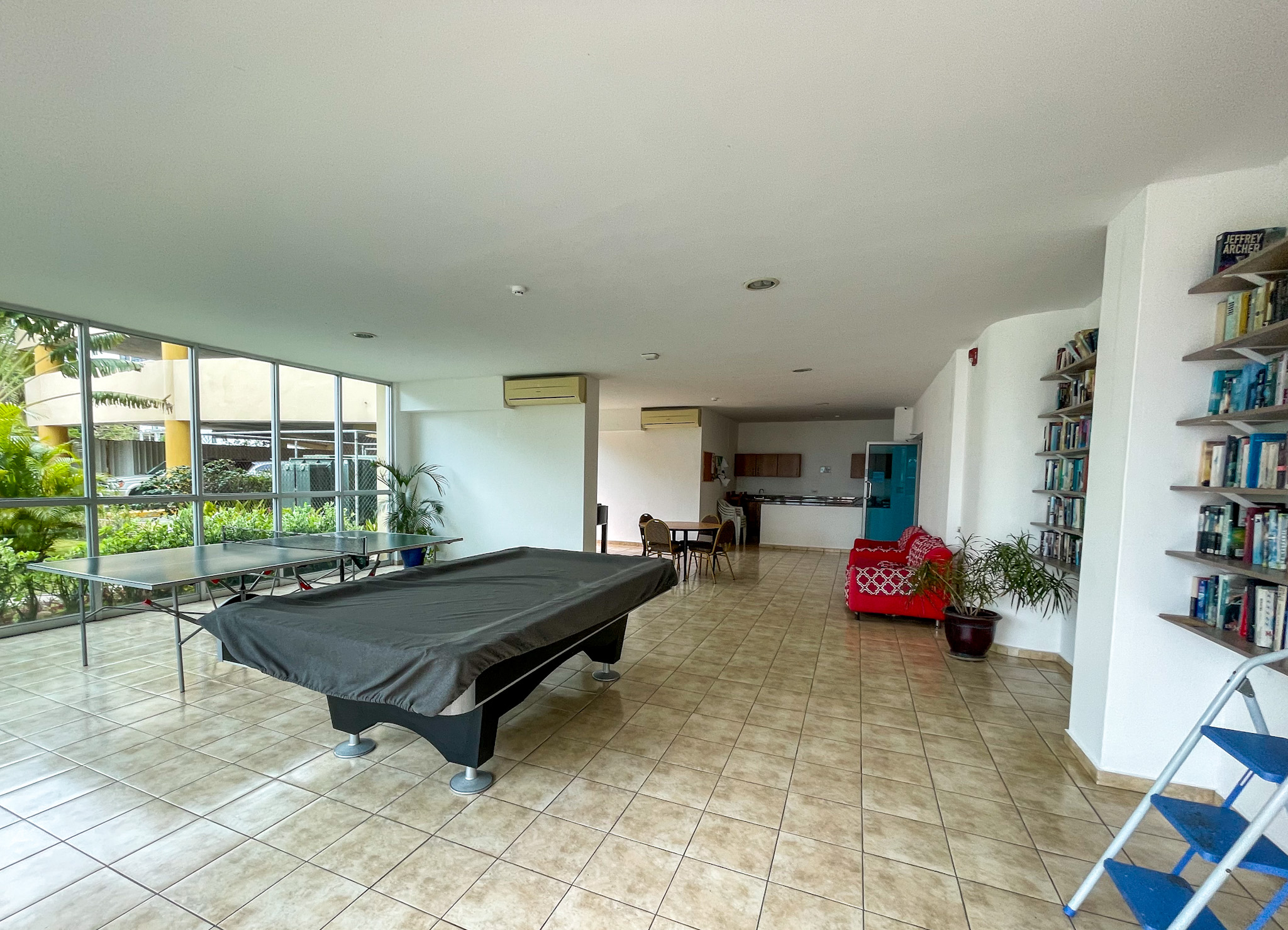 A fully equipped gym, game room, large swimming pool, and more.