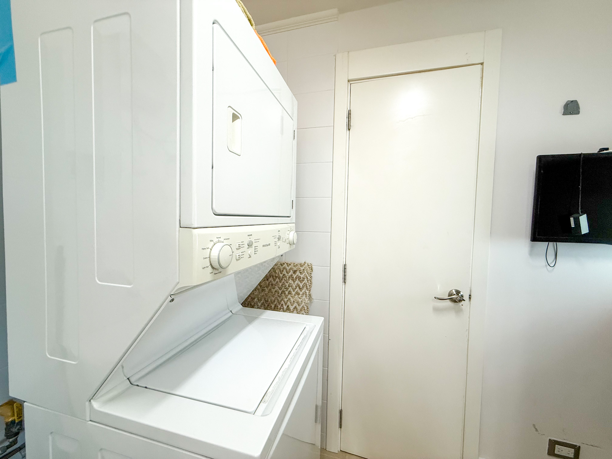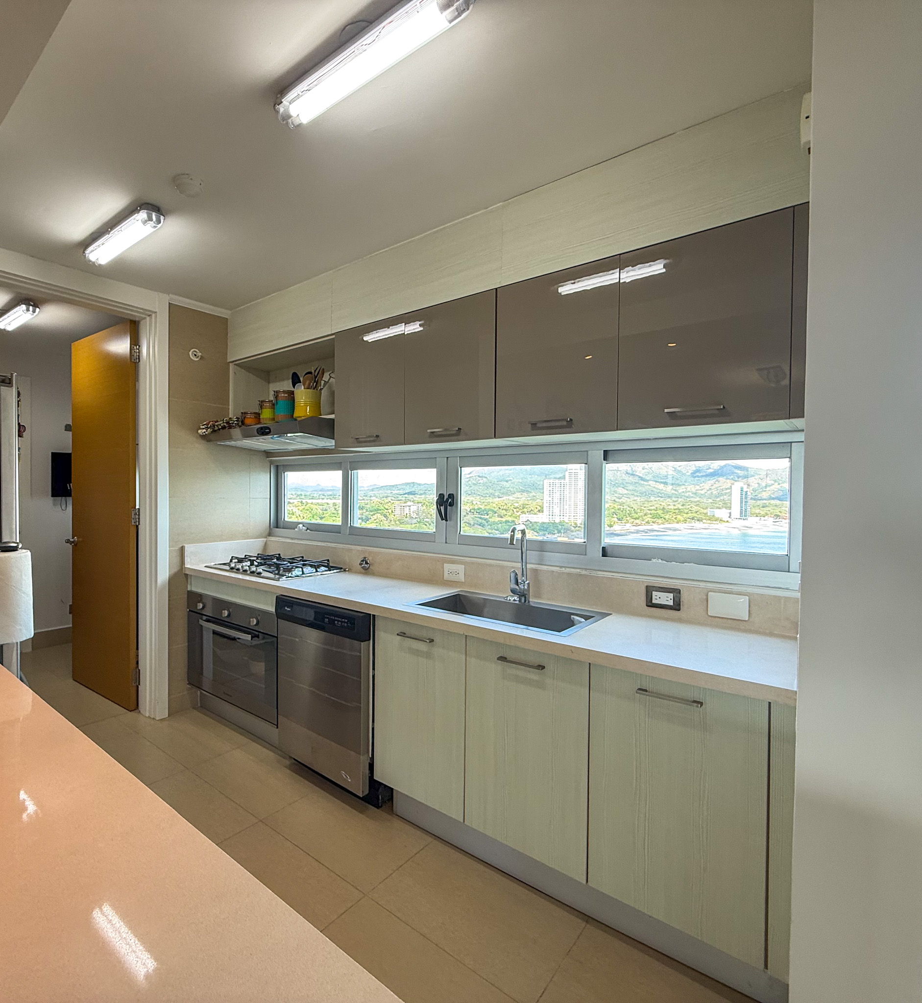 The open kitchen features expansive glass windows overlooking Gorgona’s lush green scenery, filling the space with natural light and creating a calm, tropical atmosphere. A dedicated laundry area inside the unit adds everyday convenience.