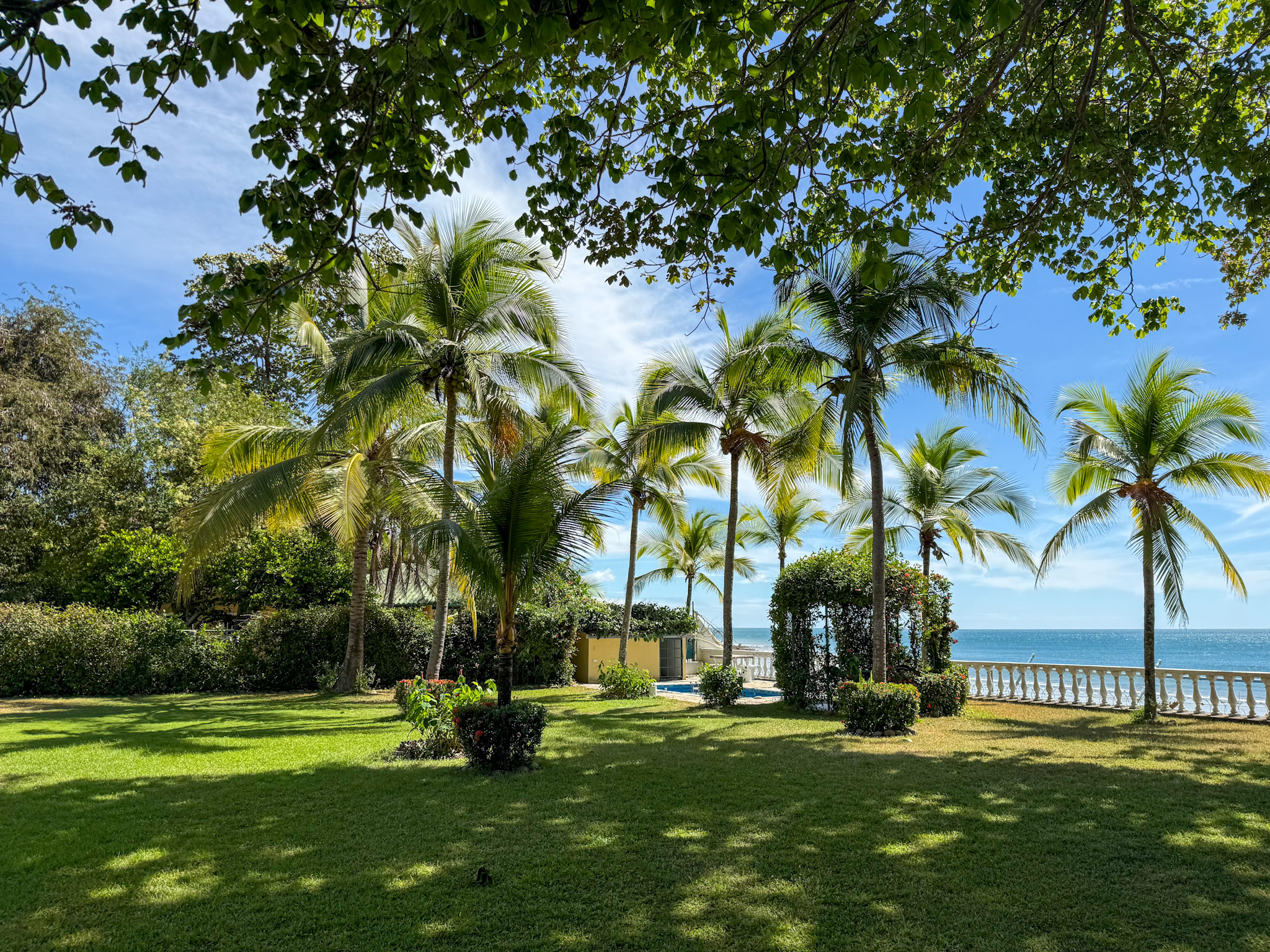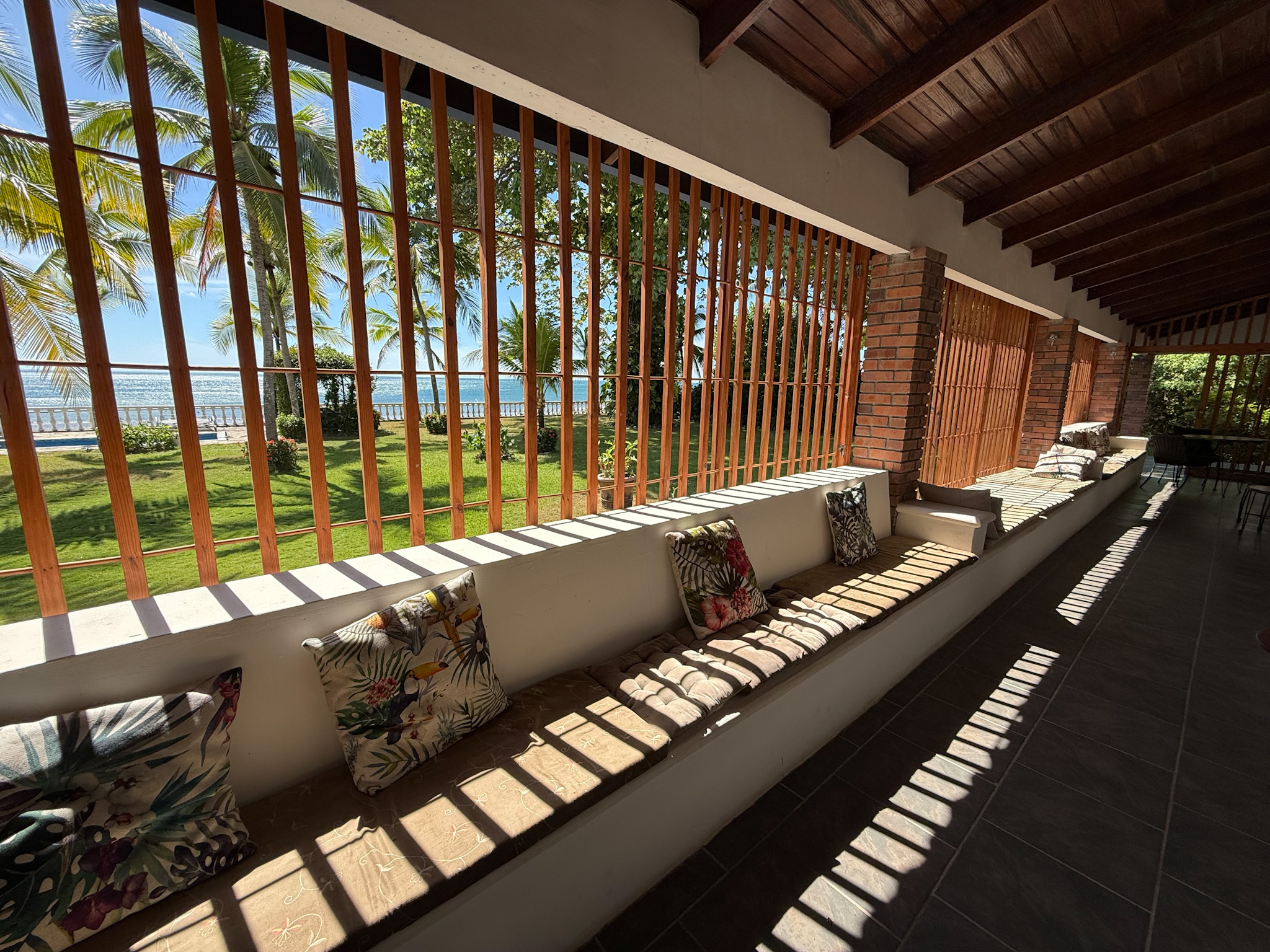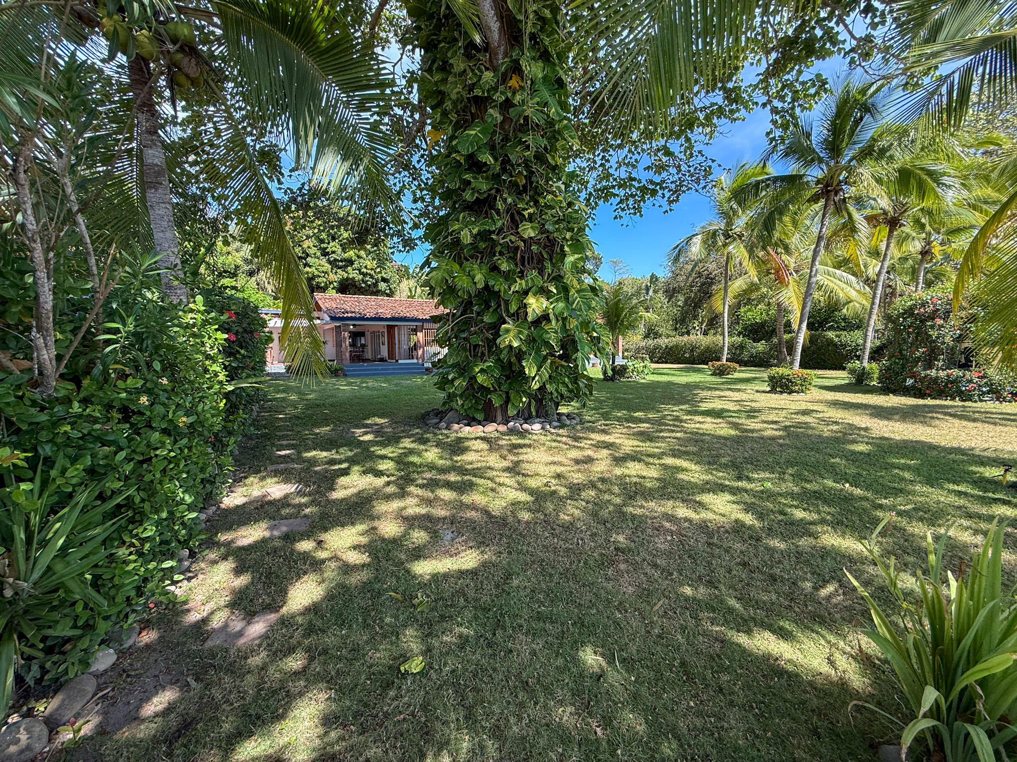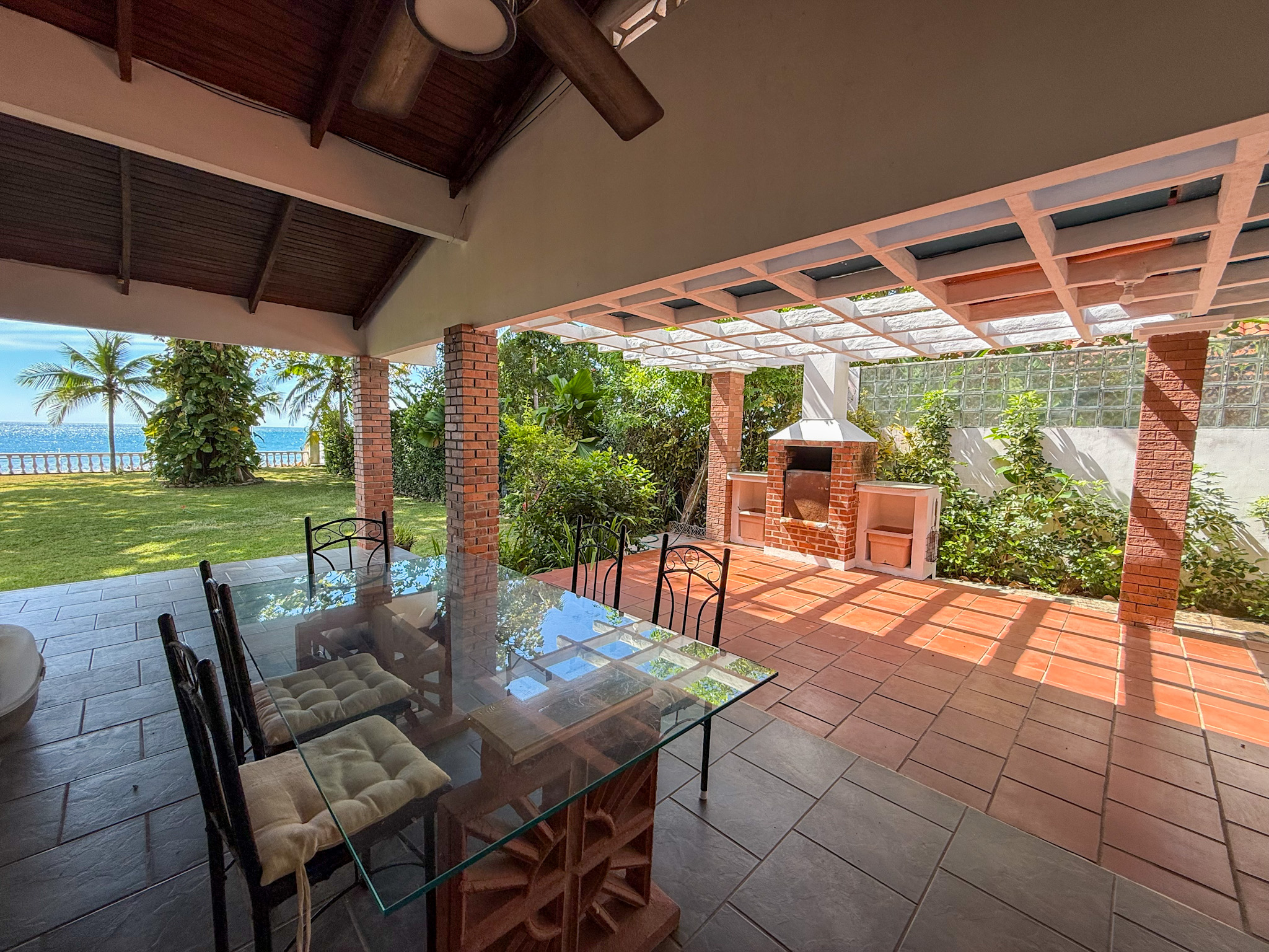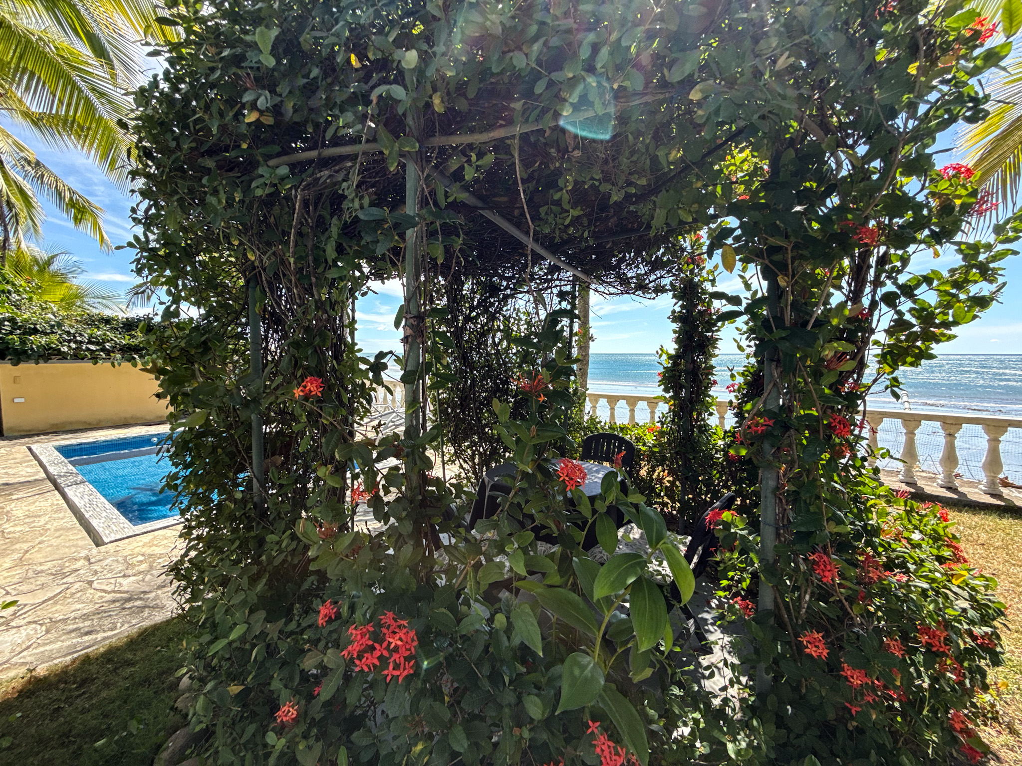 Set on 1,500 m² (0.37 acres) of lush, mature grounds, the landscaping is something that simply cannot be replicated overnight. Towering shade trees, coconut palms heavy with fruit, and a beautiful mango tree create a natural tropical canopy that keeps the outdoor spaces cool and comfortable throughout the day. This is beachfront living without harsh exposure — a rare balance of sun, shade, and ocean breeze. A natural gazebo with a covered sitting area provides the perfect setting for morning coffee, afternoon relaxation, or unforgettable sunset gatherings.