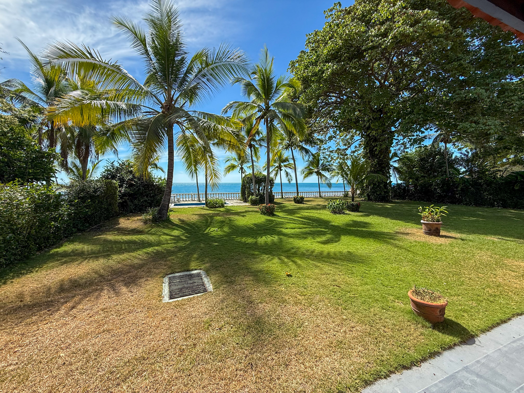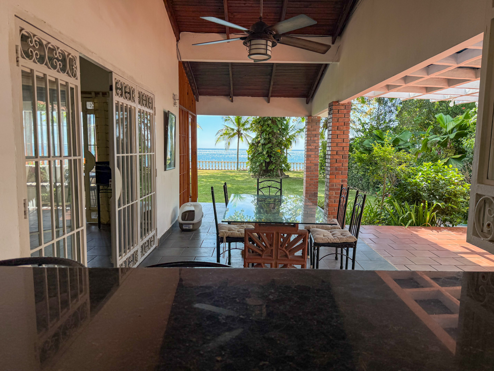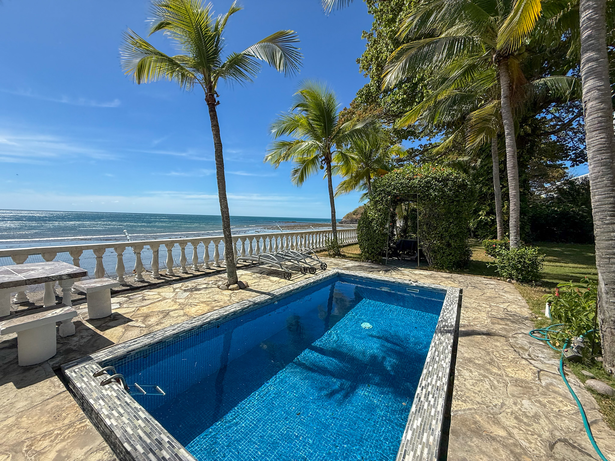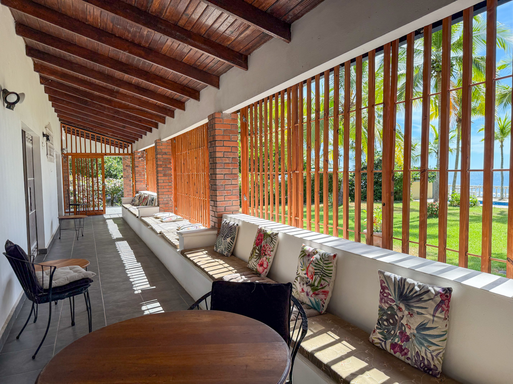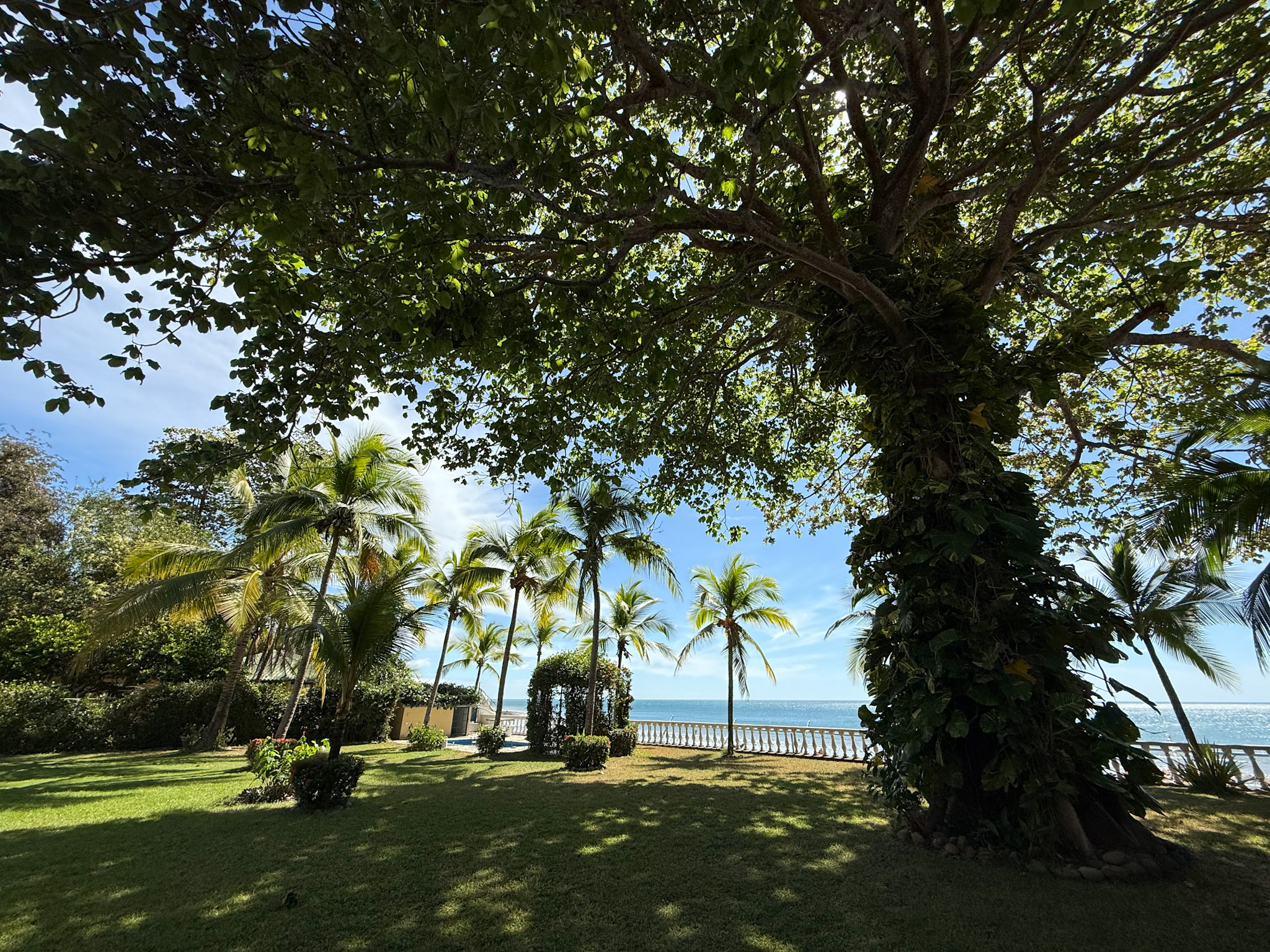 Set on 1,500 m² (0.37 acres) of lush, mature grounds, the landscaping is something that simply cannot be replicated overnight. Towering shade trees, coconut palms heavy with fruit, and a beautiful mango tree create a natural tropical canopy that keeps the outdoor spaces cool and comfortable throughout the day. This is beachfront living without harsh exposure — a rare balance of sun, shade, and ocean breeze. A natural gazebo with a covered sitting area provides the perfect setting for morning coffee, afternoon relaxation, or unforgettable sunset gatherings.