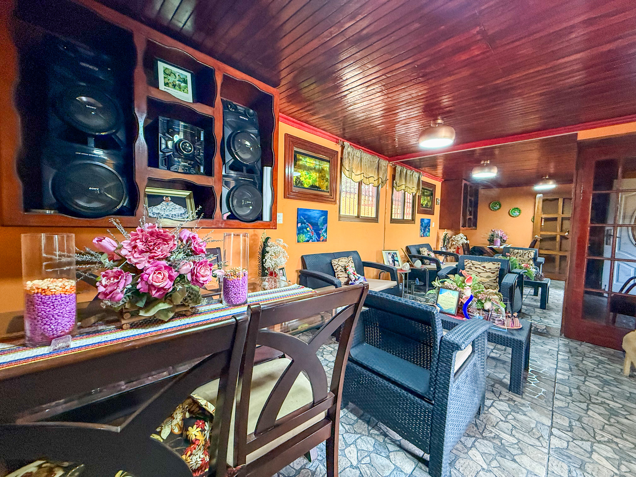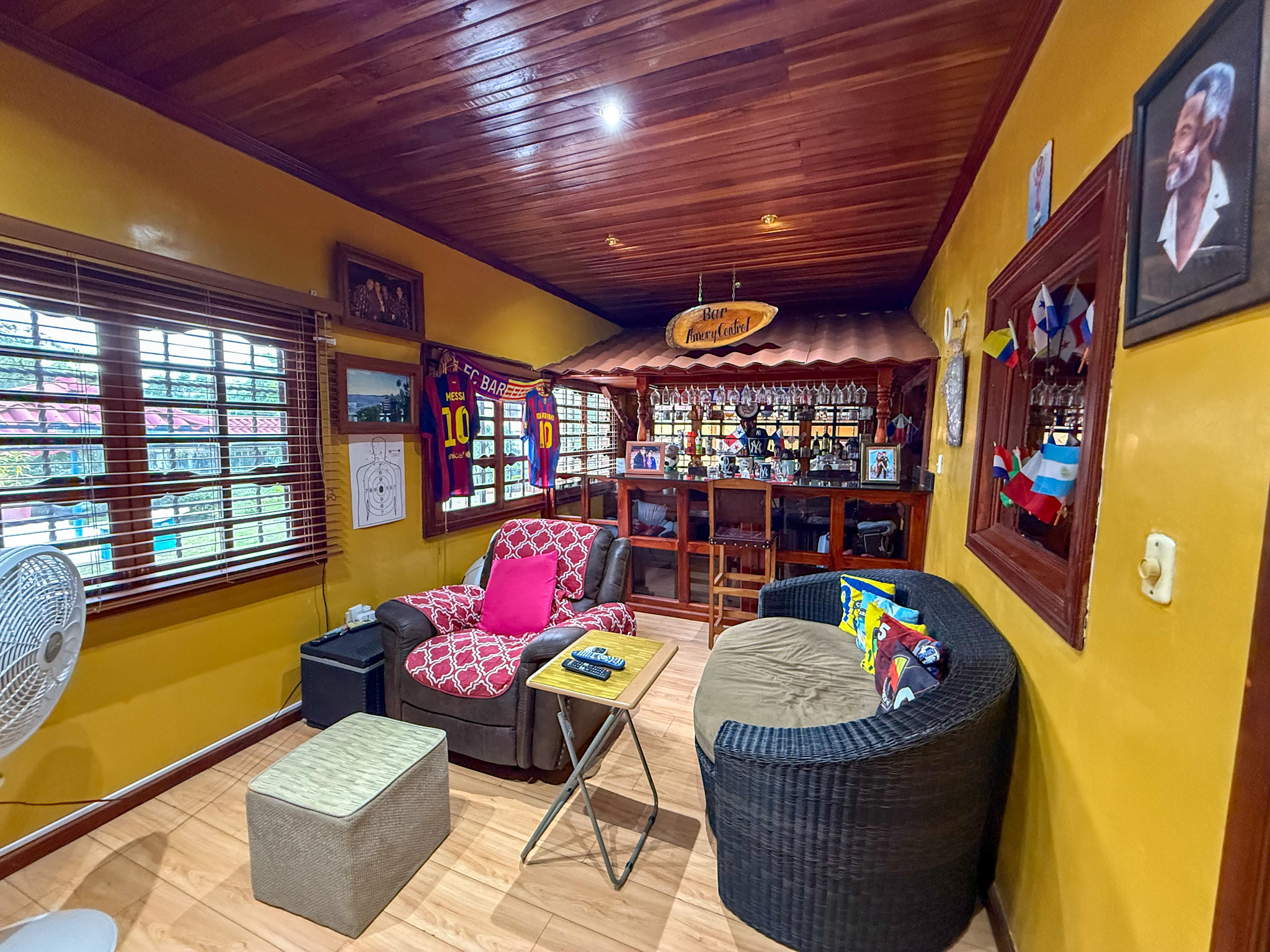 The home has a total construction size of 154.21 m² (approximately 1,660 ft²) and includes a covered terrace that opens into the living area. To the right is one bedroom, while to the left you’ll find another bedroom, the kitchen, and a pantry. The property also features an indoor bar and family room, perfect for watching sports or gathering with friends.