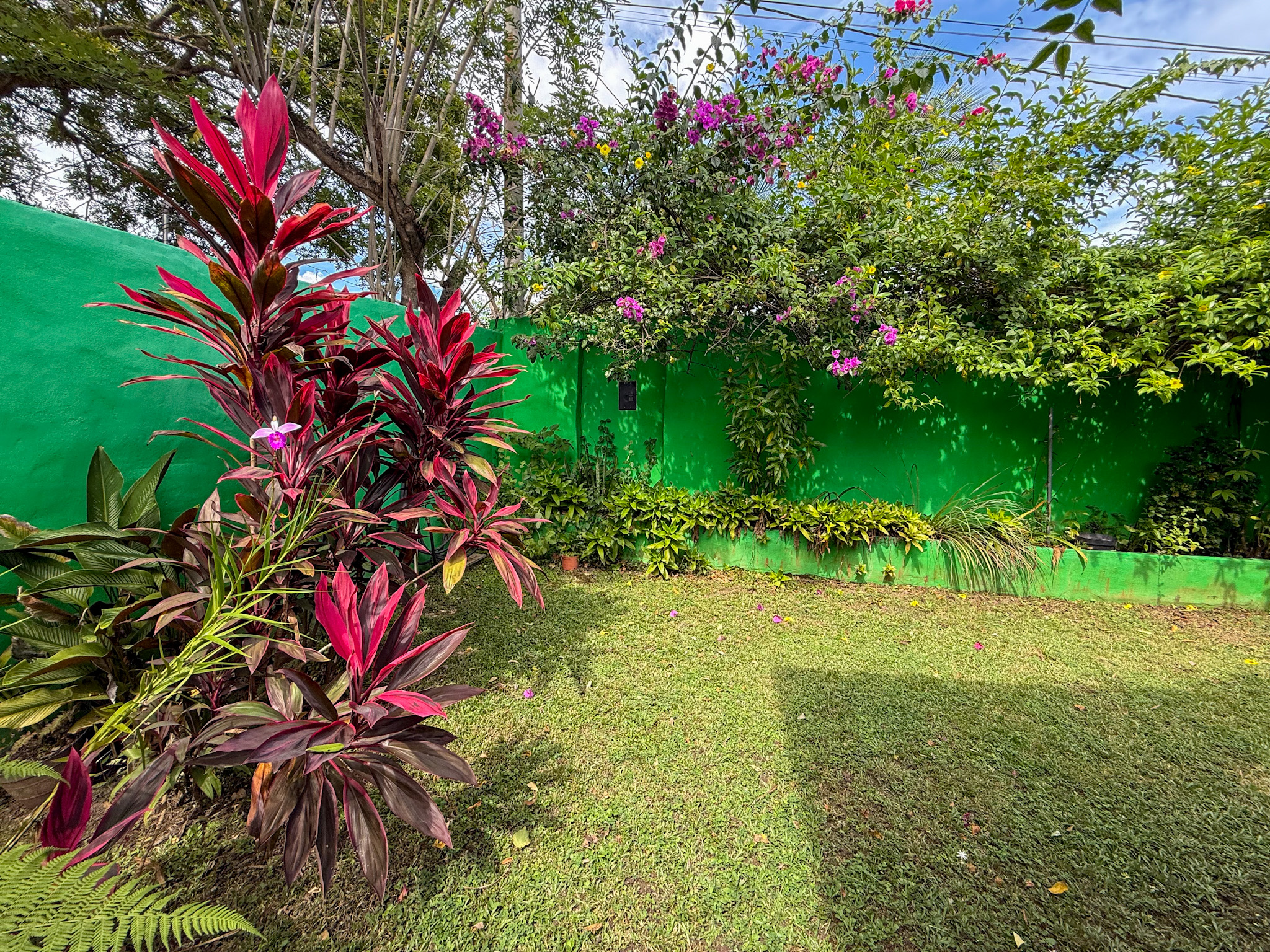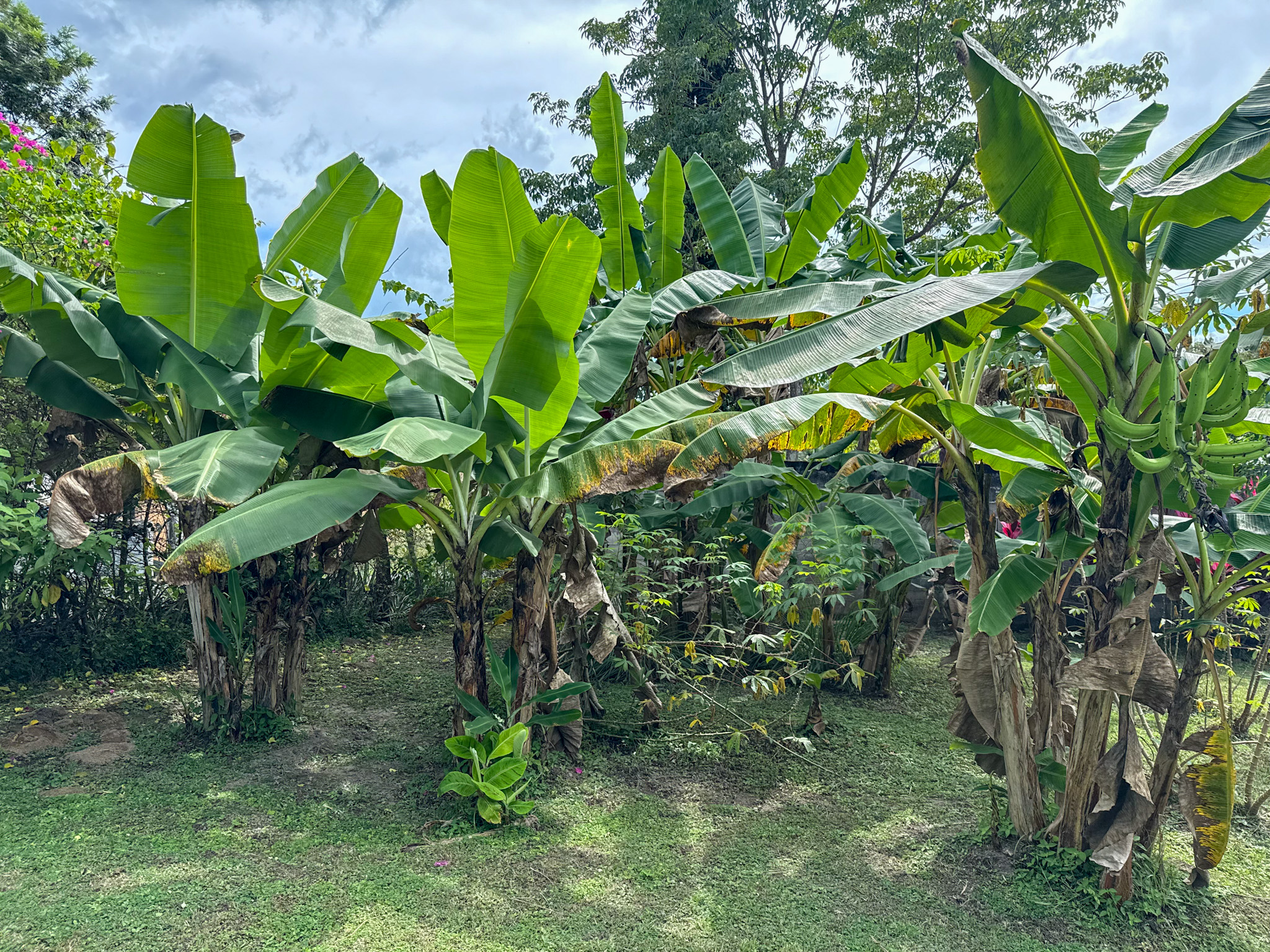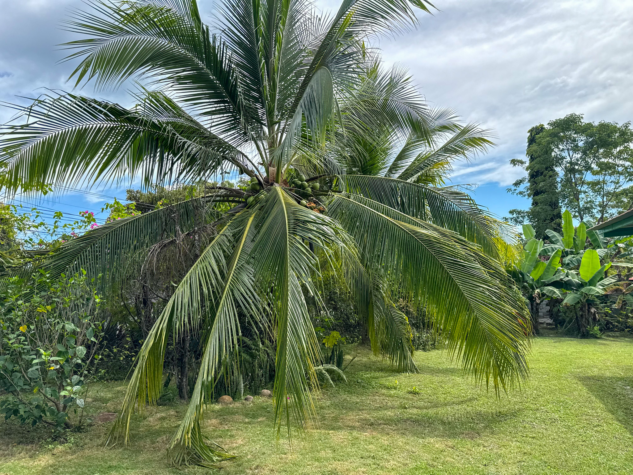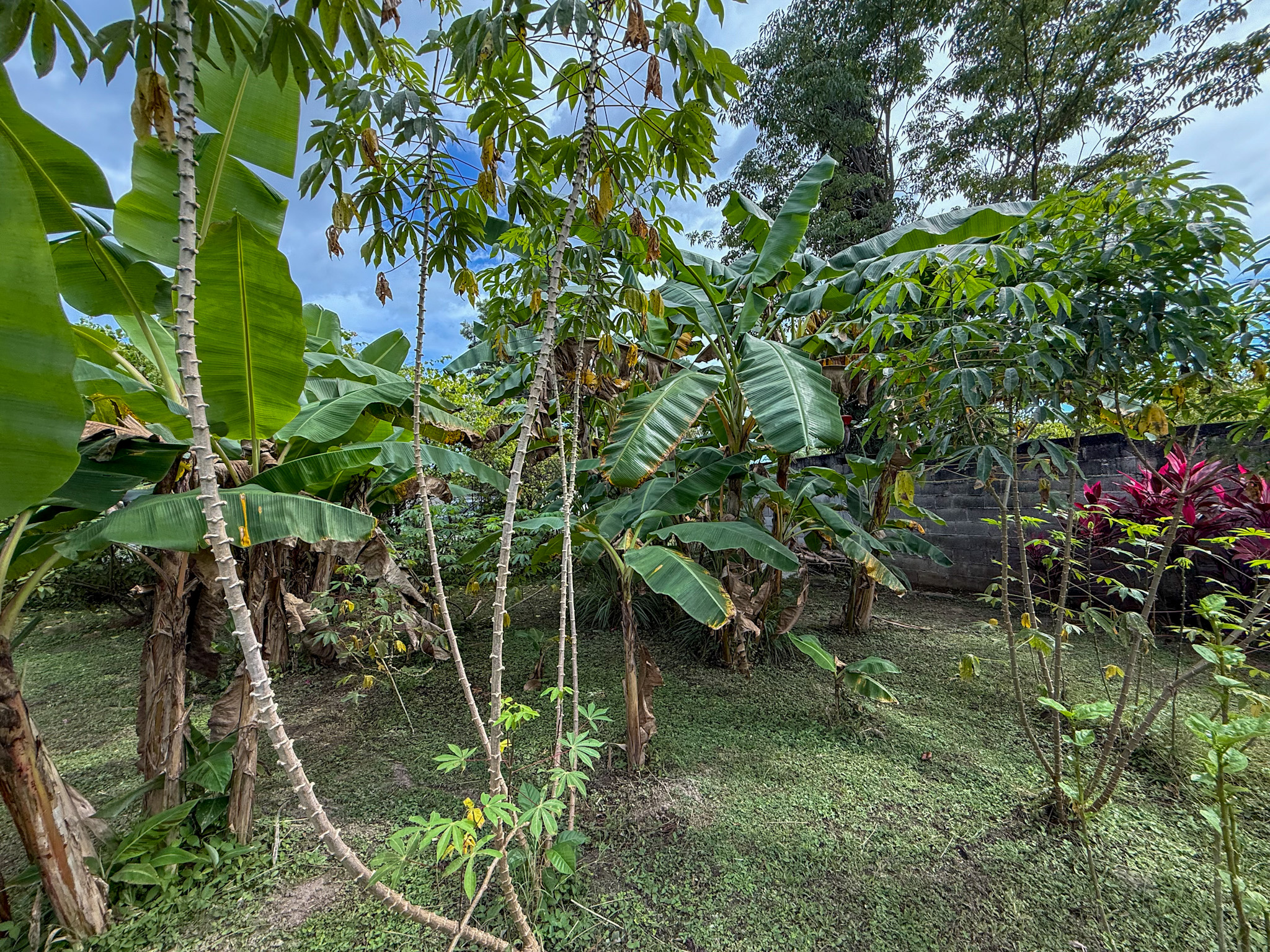 The landscaped garden features multiple fruit-producing plants including coconuts, three varieties of bananas, plantain, yucca, papaya, and Persian lime. Ideal for those who enjoy gardening, fresh fruit from their own yard, and outdoor living.