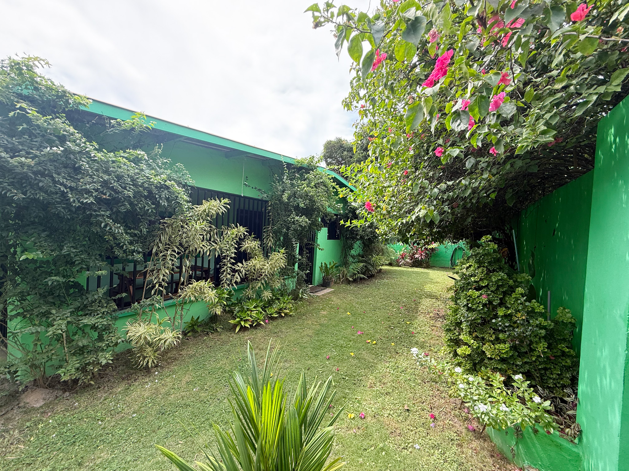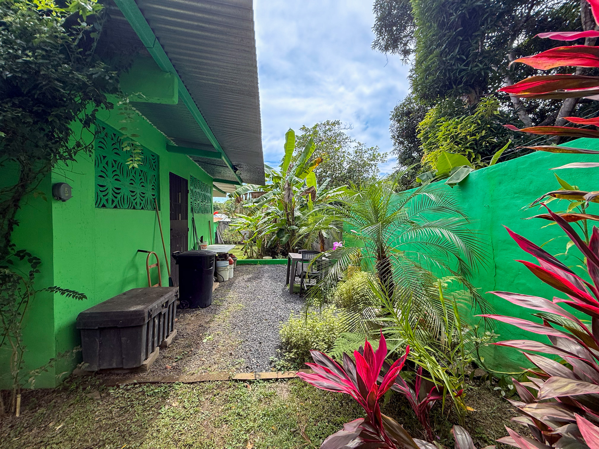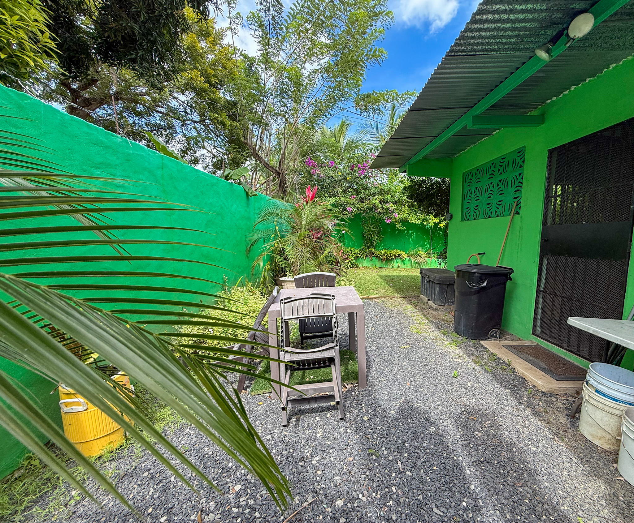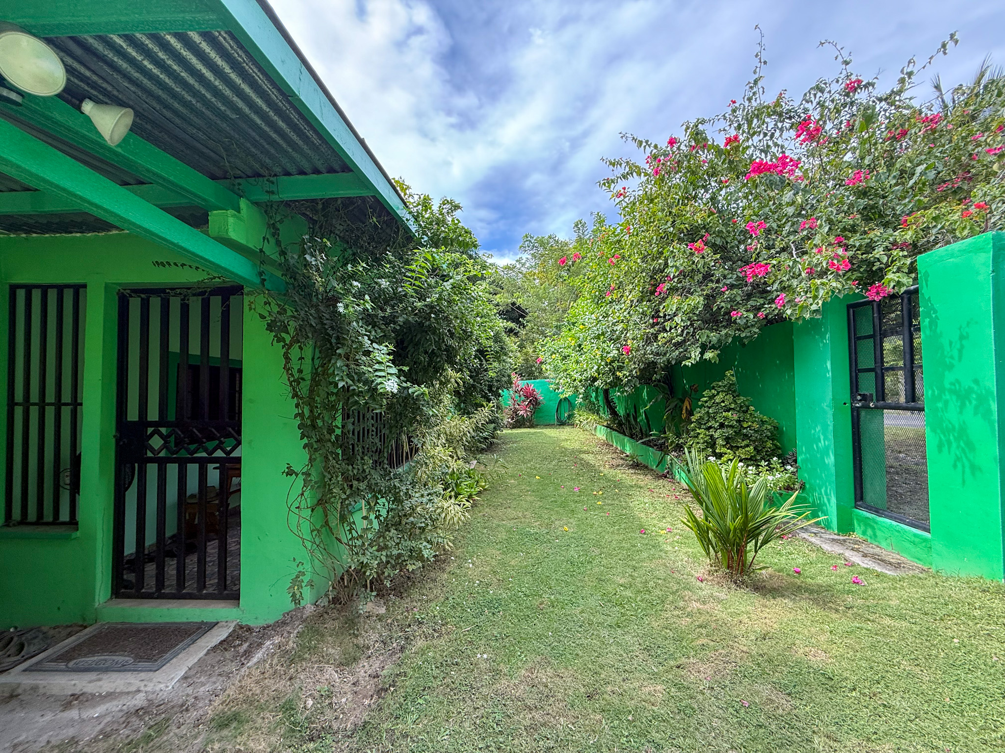 The landscaped garden features multiple fruit-producing plants including coconuts, three varieties of bananas, plantain, yucca, papaya, and Persian lime. Ideal for those who enjoy gardening, fresh fruit from their own yard, and outdoor living.