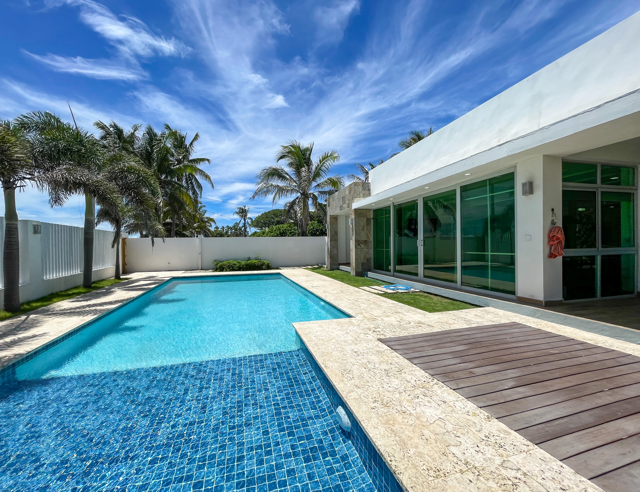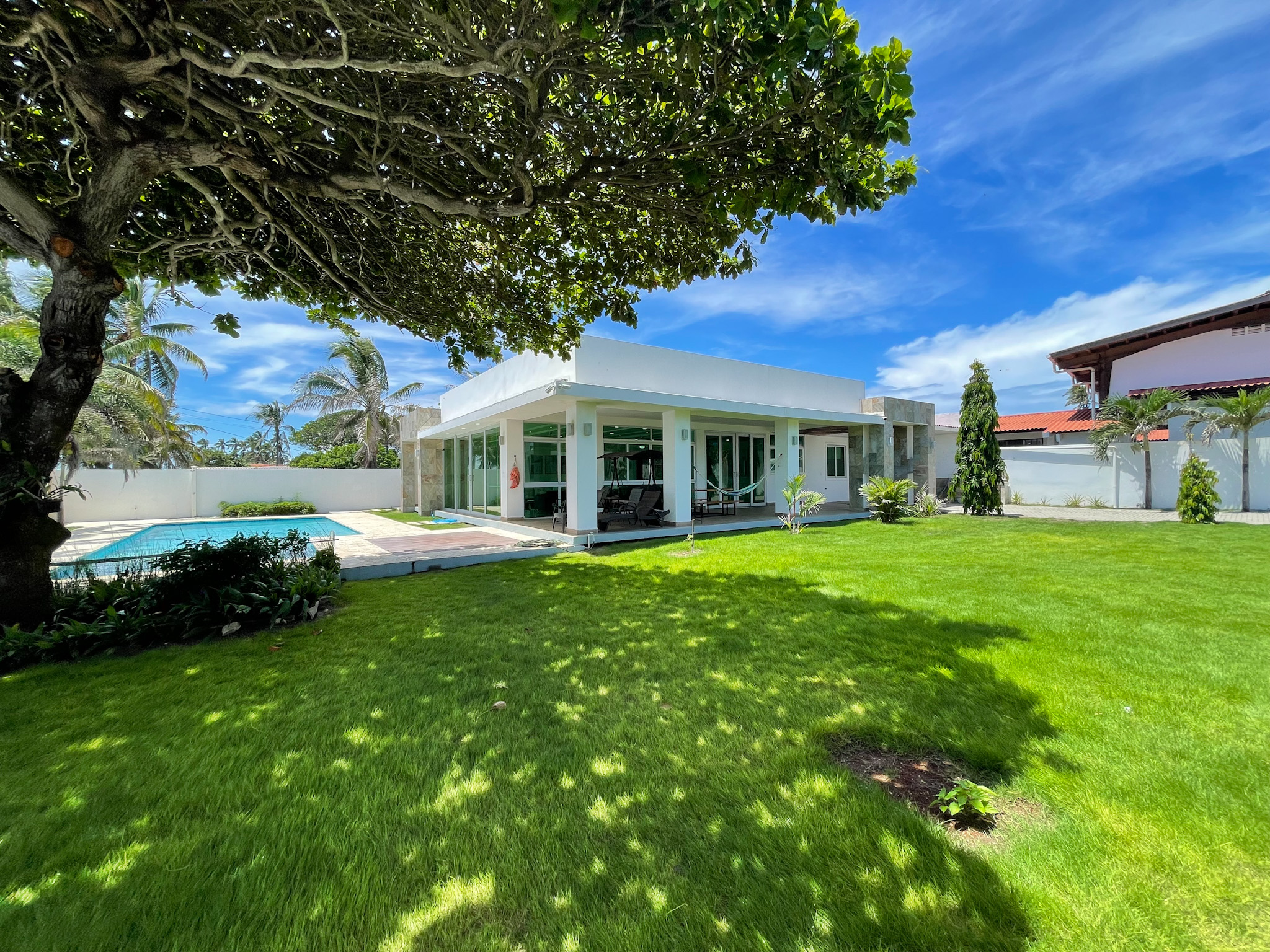 Outdoor Oasis: Step into the outdoor oasis to discover a beautifully landscaped, well-maintained private pool exuding elegance and tranquility. The expansive lot features a lush green garden with a shade-providing tree and palm trees encircling the property, creating a serene atmosphere. Adjacent to the pool, a large terrace beckons with a hammock and covered seating area, offering a perfect spot for relaxation and outdoor gatherings. The property is fully fenced for privacy, ideal for those seeking anonymity and a quiet retreat. An outdoor shower and additional bathroom add convenience, complementing the peaceful beachfront lifestyle.