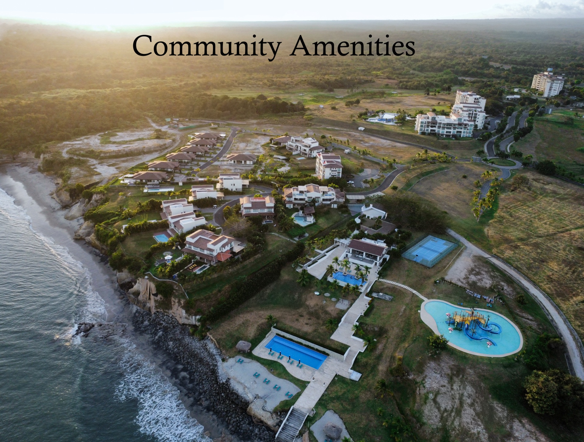 Set within a natural oceanfront setting, the community features landscaped green paths and parks, a beach club with swimming pools, restaurant, water park, a 9-hole illuminated golf course, a sports club, and over one kilometer of exclusive beachfront ideal for surfing and water sports, framed by dramatic cliffs and breathtaking views.