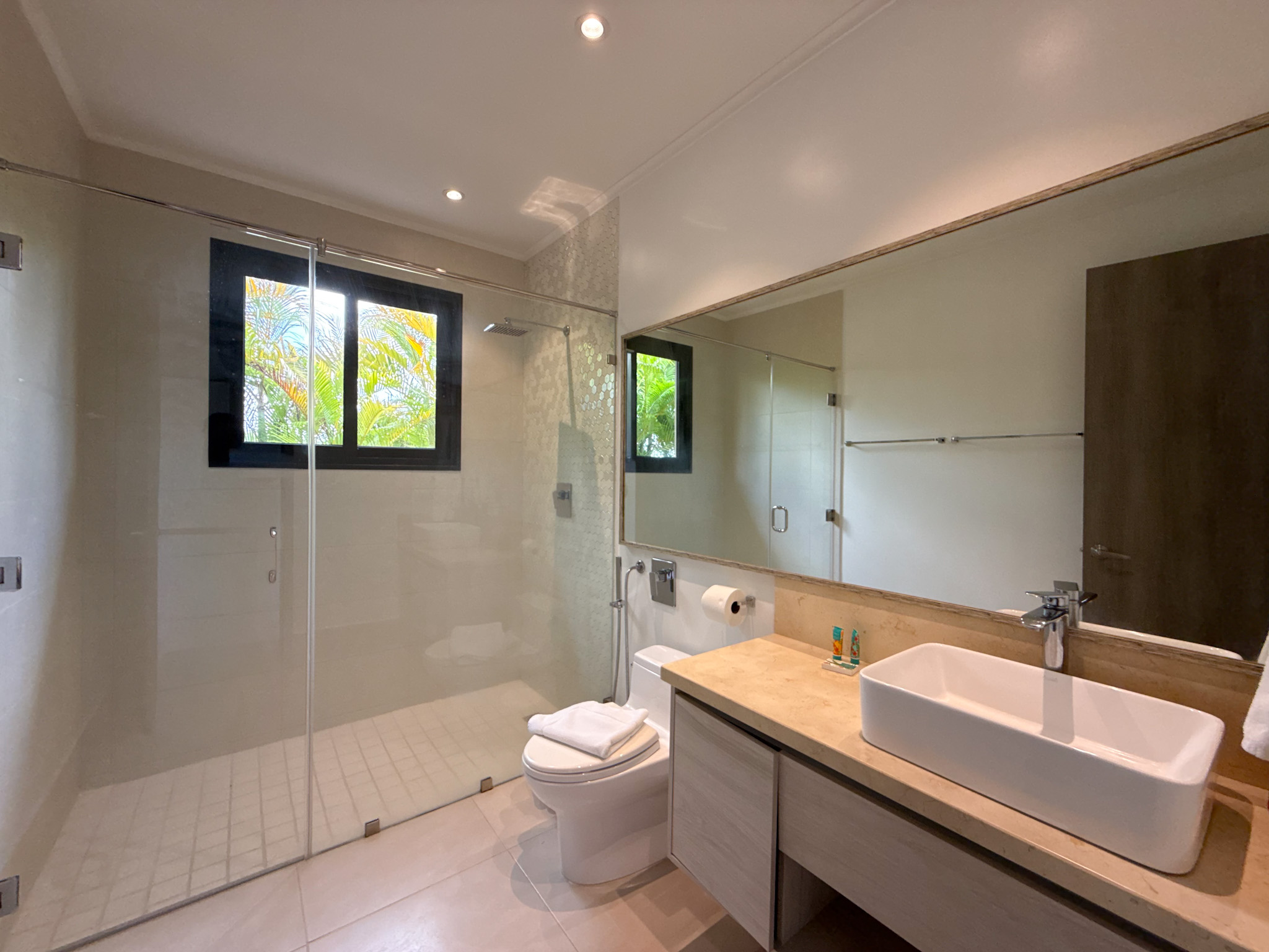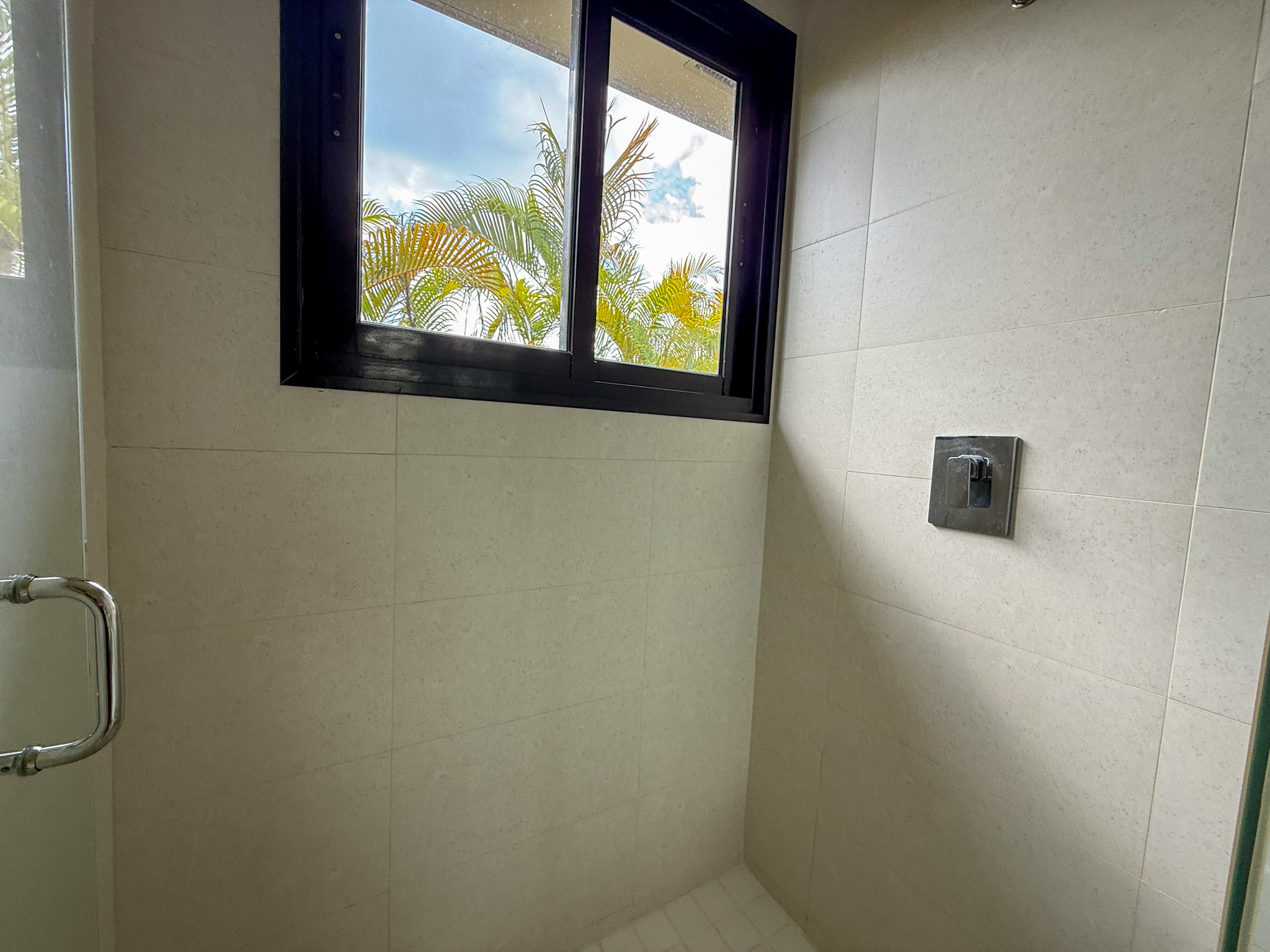 The residence offers 3 bedrooms, including 2 bedrooms with ensuite bathrooms, plus an additional bathroom serving guests and the third bedroom. The primary bedroom opens directly to the backyard pool area, creating a seamless indoor–outdoor connection. A covered terrace overlooking the pool provides an ideal space for lounging or hosting guests.