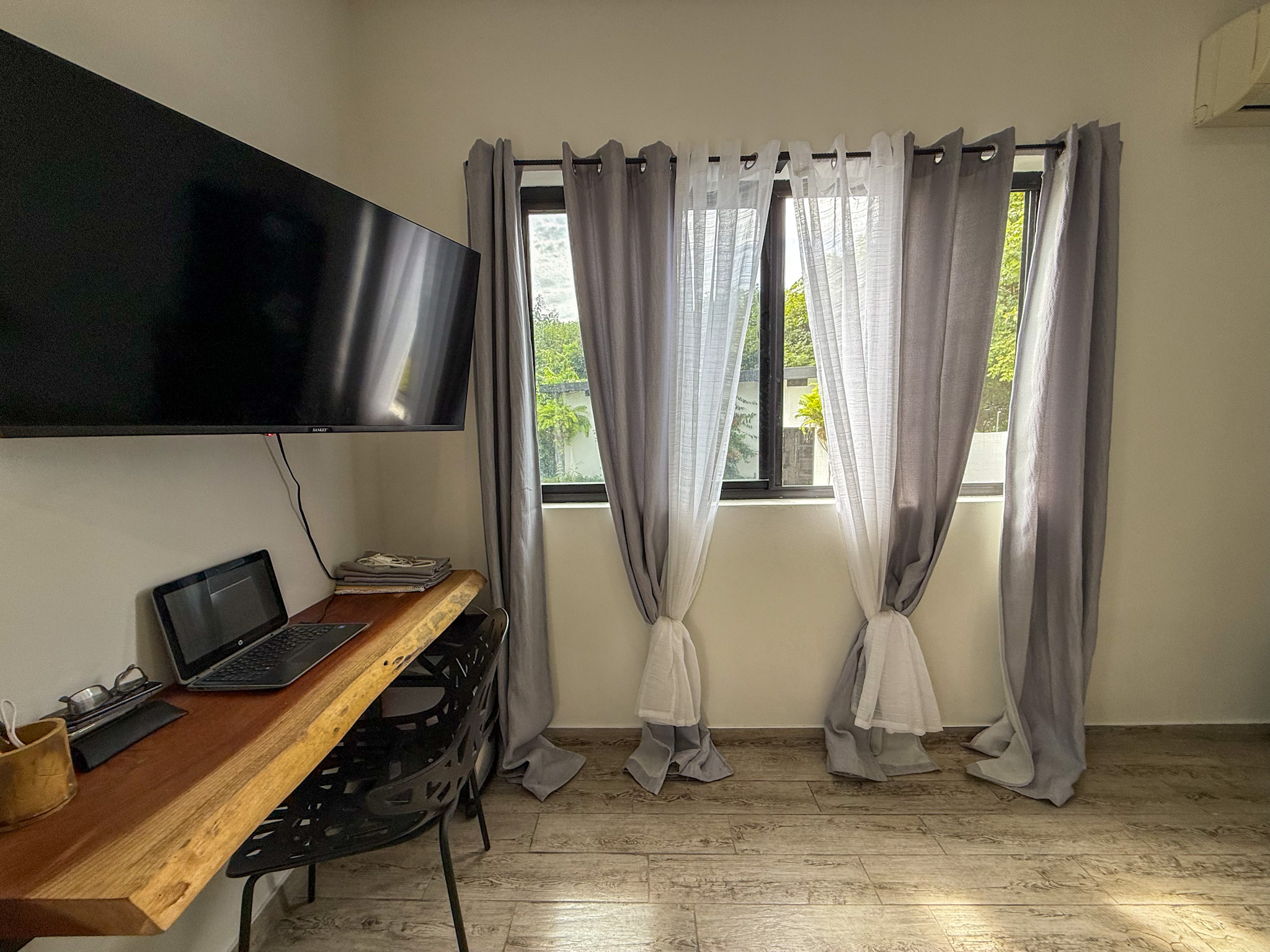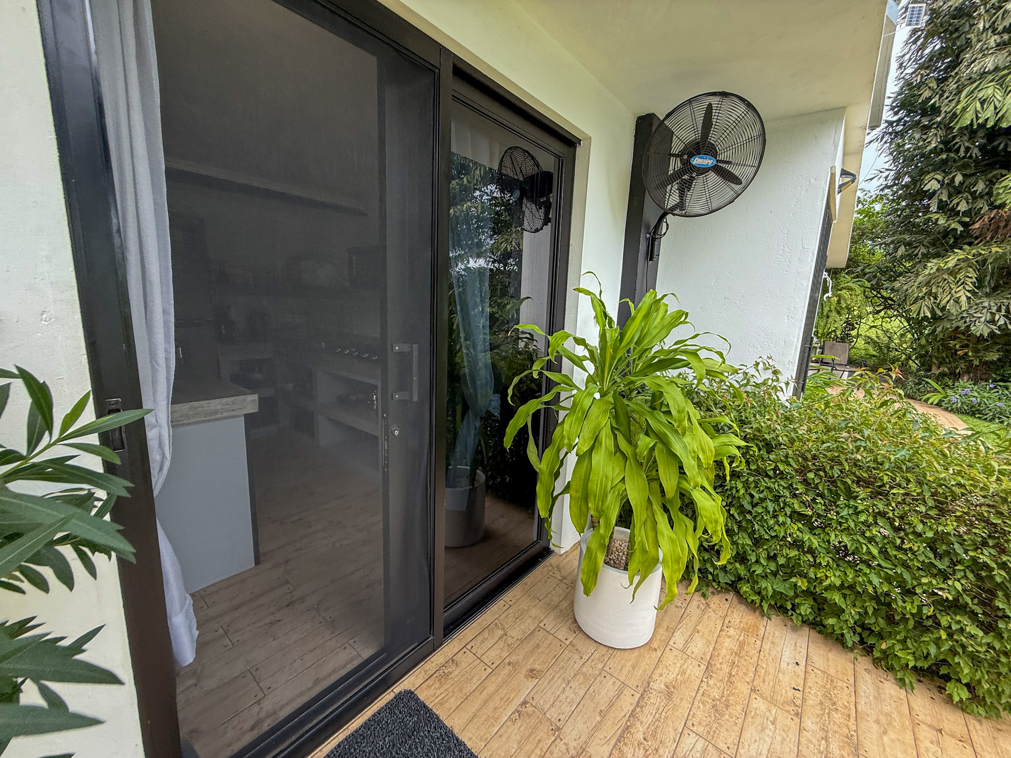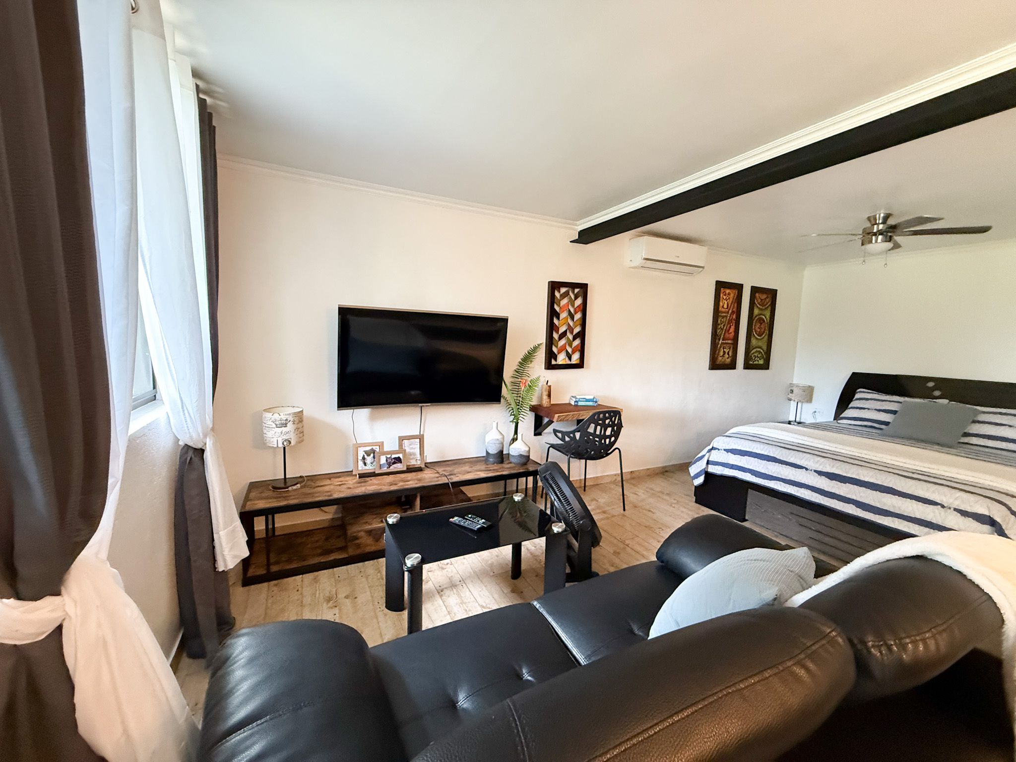 On the ground floor, the property includes a fully independent, furnished 527 square feet (49- square meters) apartment with a private entrance. This unit features a kitchen, a living and sleeping area, and 1 bedroom. It is currently a reliable income-generating rental that stays consistently booked. Adjacent to this apartment is an additional enclosed room that can be converted into a second apartment, offering even more rental potential.