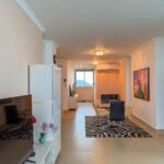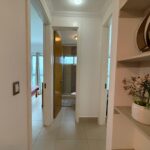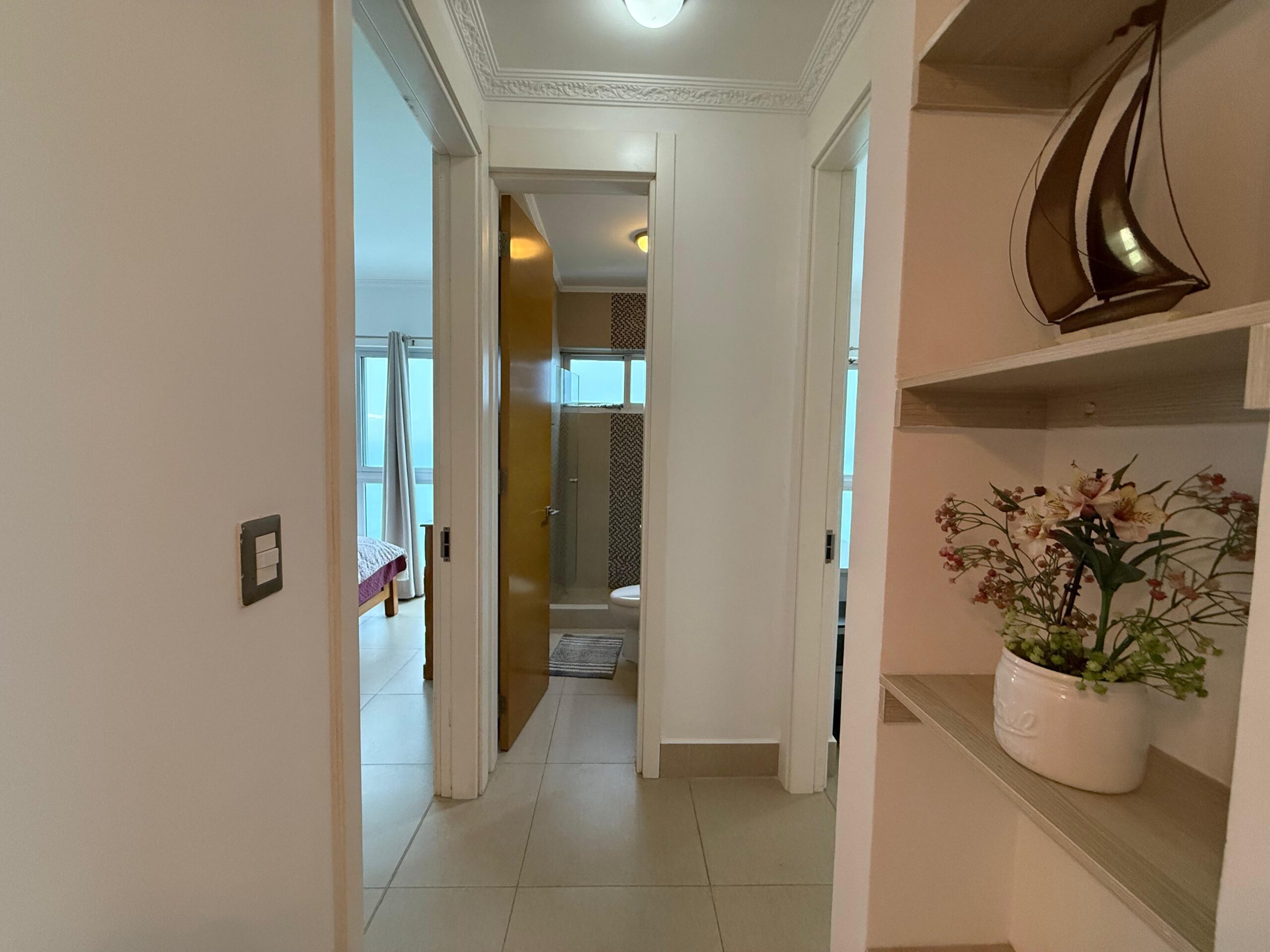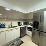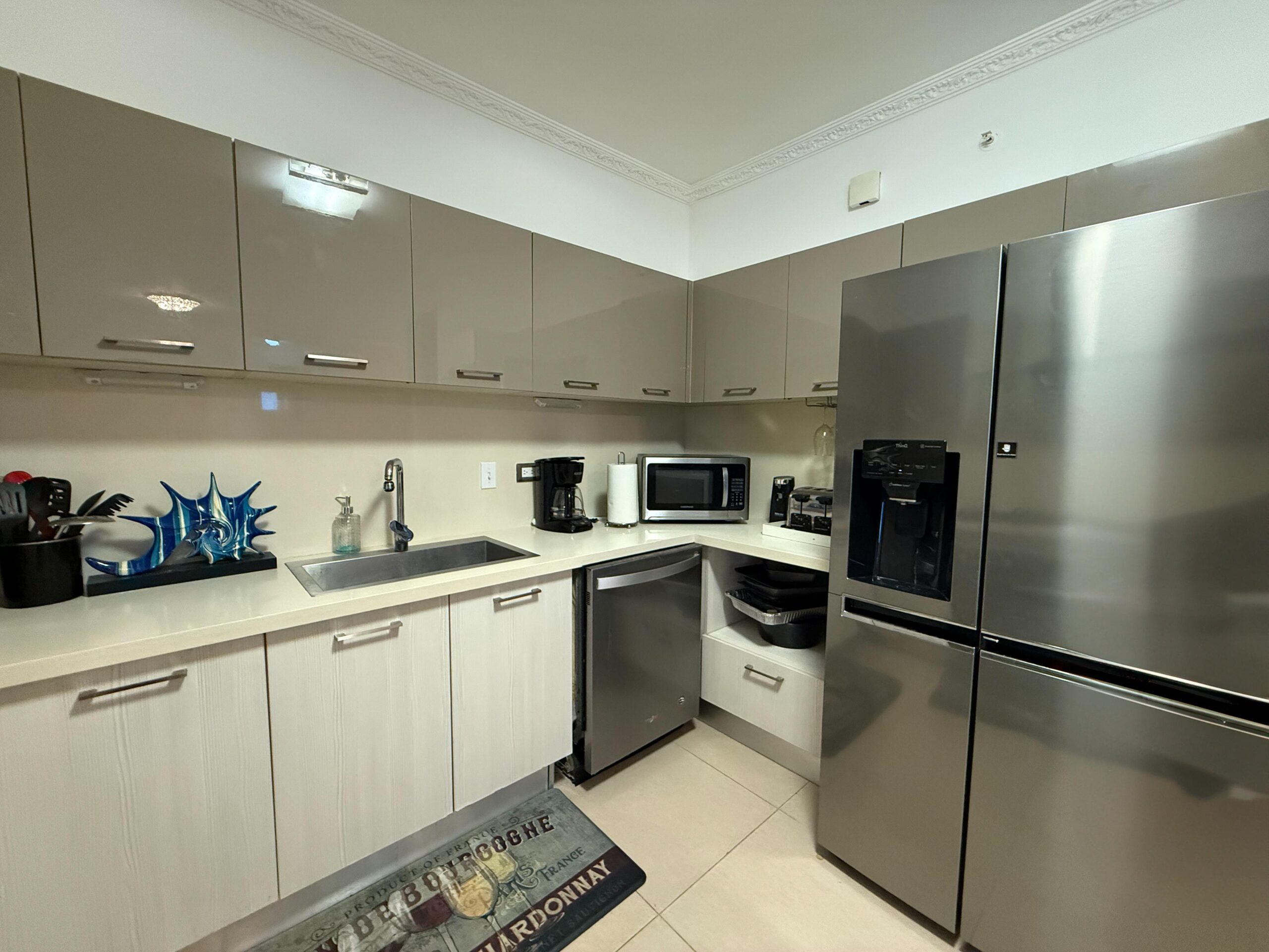 As you enter the unit, you are greeted by a spacious, open-concept layout. A dedicated entryway creates a welcoming first impression. To the left, you will find a convenient half-bathroom for visitors, and to the right, a fully equipped modern kitchen complete with refrigerator, stove, dishwasher, and plenty of storage. A large living area, where floor-to-ceiling glass windows invite in natural light and showcase panoramic ocean views.